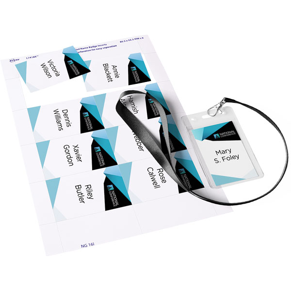All-in-one name badge kit contains: - 10 portrait orientation reusable badge holders, - 10 lanyards, - 2 sheets of 150gsm printable insert cards, each with 8 perforated name cards